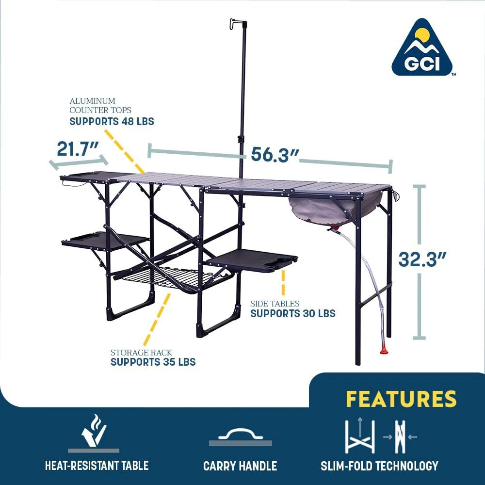 Портативный складной алюминиевый стол Эта портативная кухня наполнена функциями (включая раковину с мягкой оболочкой!), Что делает ее идеальным дополнением к вашим основным веществам или кемпинге.