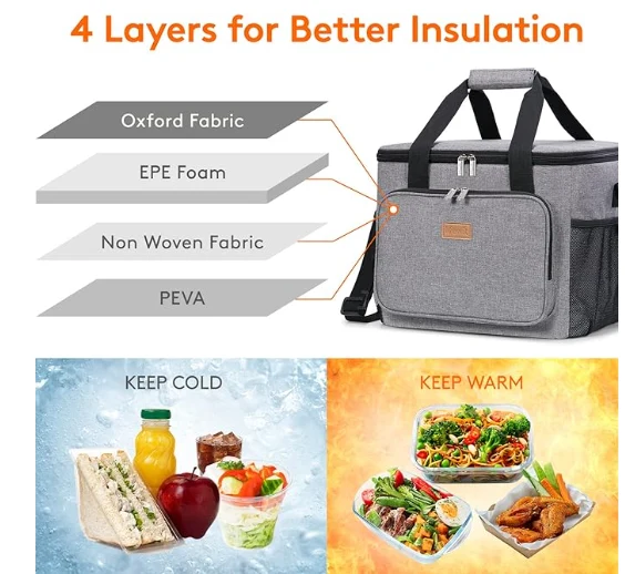 Изолированная сумка для пикника, сумка для обедов изготовлен из изолированного материала, который может сохранять пищу и напитки прохладной или теплой в течение более 5 часов. Кроме того, внутренняя подкладка изготовлена из пищевой фольги, так что вы можете положить свою еду напрямую в сумку без каких -либо проблем. Встроенная 6-миллиметровая пена EPE обеспечивает отличную защиту ваших контейнеров, еды и напитков.