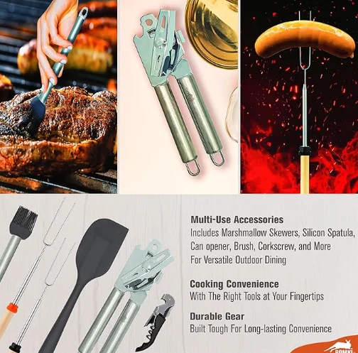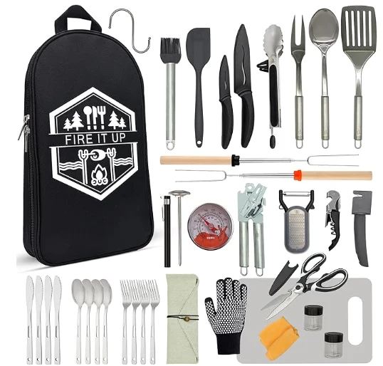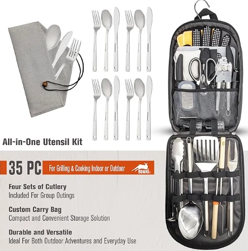 Сумка для хранения посуды на открытом воздухе. Этот набор для приготовления пищи 35 ПК является полным решением для ваших потребностей в приготовлении на открытом воздухе. Он включает в себя кухонный набор для кемпинга и кухонную утварь, все аккуратно упакованные в нестандартную сумку с дополнительными отсеками и двумя обратными карманами. Набор предназначен для того, чтобы удовлетворить все ваши предметы первой необходимости в кемпинге, что делает его незаменимым дополнением к вашему кемпингу