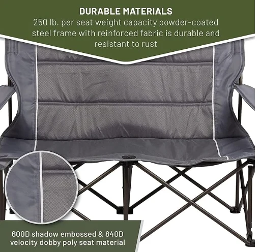 Размер настройки кемпинга составляет 17,72 "x 41,34" x 32,28 ", размер складывания составляет 11,02" x 9,45 "x 32,28". Максимальная нагрузка составляет 500 фунтов. Серьерия дизайна может использоваться в качестве газонного кресла, кемпингового дивана, кресла на открытом воздухе или спортивного кресла для взрослых в различных мероприятиях