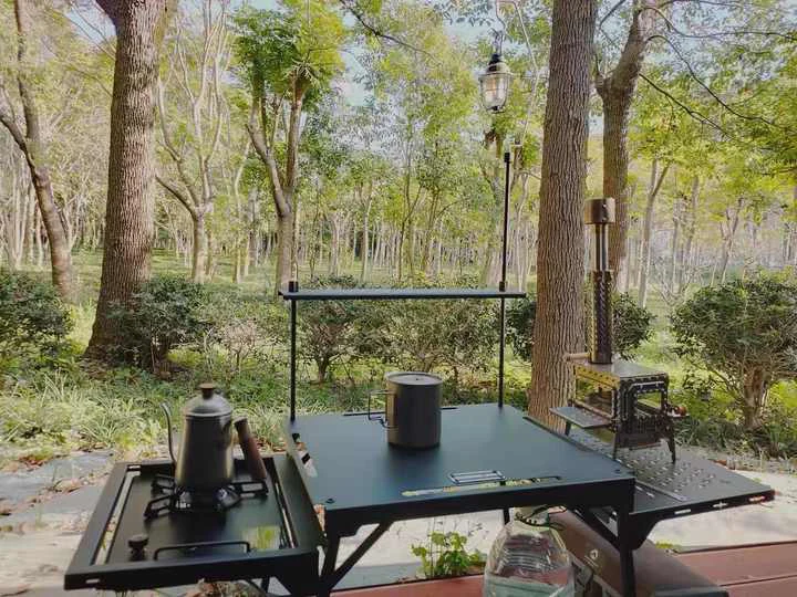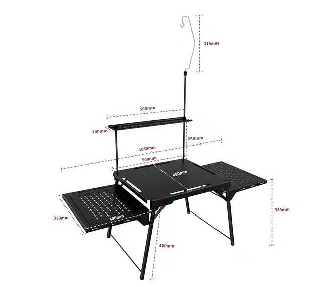 Портативный складывающий алюминиевый столик для кемпинга, столовая платформа состоит из верхних, средних и нижних частей, с достаточным пространством для хранения всех видов посуды, продуктов питания и приправ.