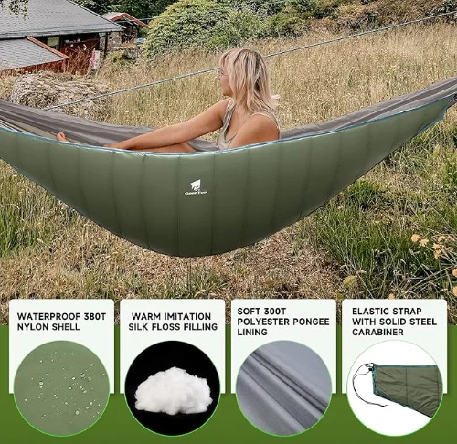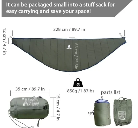 Одеяло гамака 3 - 4 сезона идеально подходит для температуры от 41 ° F до 68 ° F; Он идеально подходит для подвески гамака, который защищает вас от ветра и держит вас тепло.